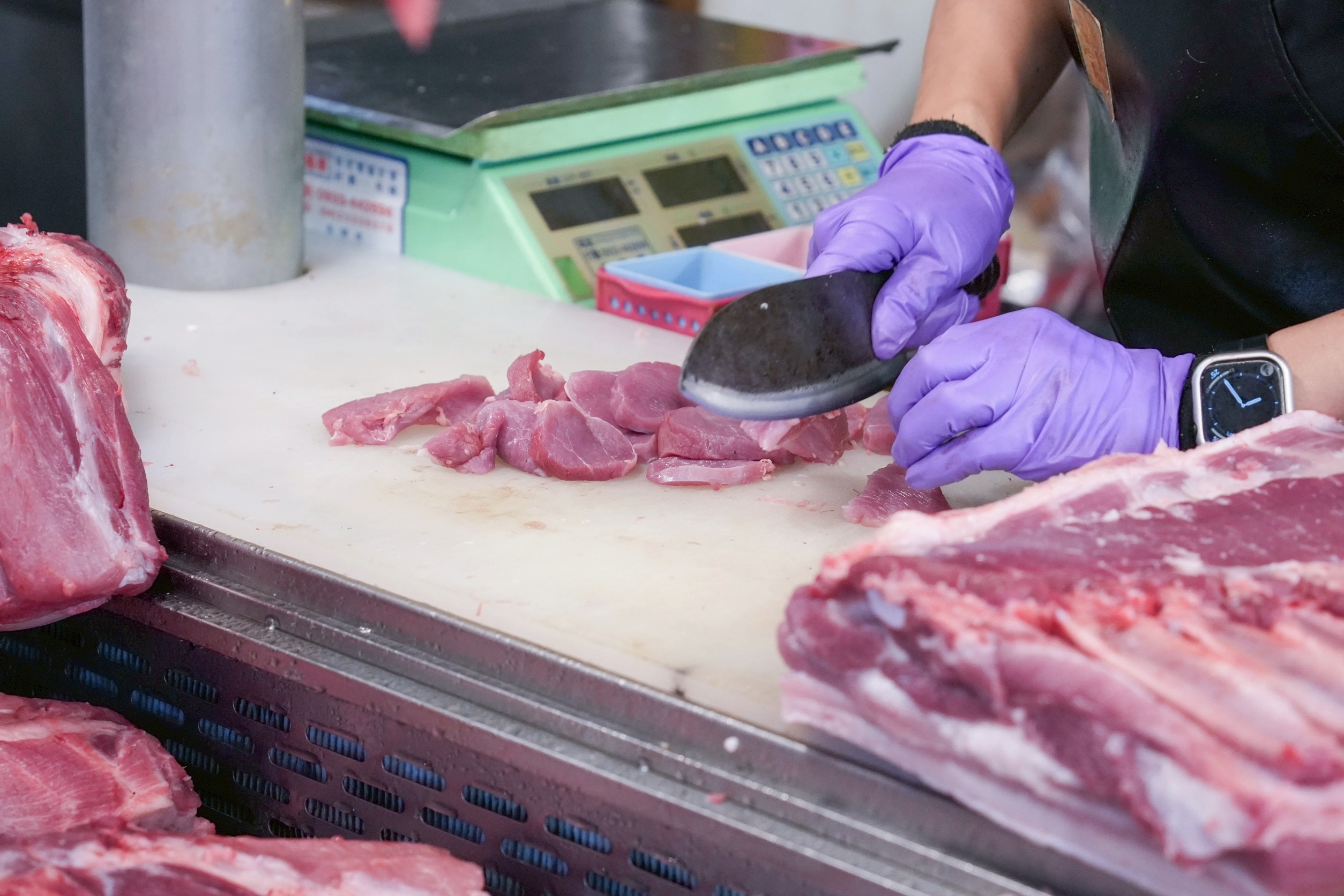 因應非洲豬瘟禁令解除,全國恢復豬隻拍賣與屠宰作業,市場豬肉攤今(8)日全面回歸正常。台中市長盧秀燕一早7時30分就來到建國公有市場肉品區,關心豬肉供應與價格變化,與攤商寒暄打氣,與民眾互動,了解大家的購買心聲。盧市長表示,隨著市場溫體豬販售逐步恢復營運,購買需求也明顯提升,市府會繼續觀察市場價格及供應情形,並確保食品衛生安全,讓市民能安心選購新鮮國產食材。