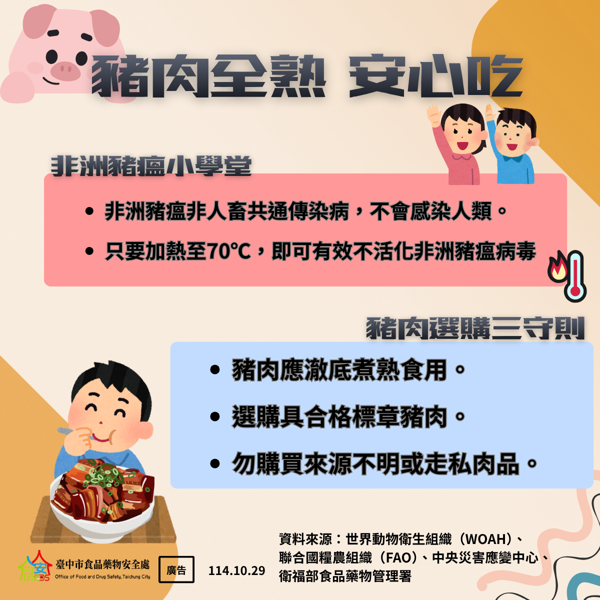 近期非洲豬瘟持續升溫,食安處提醒大家: